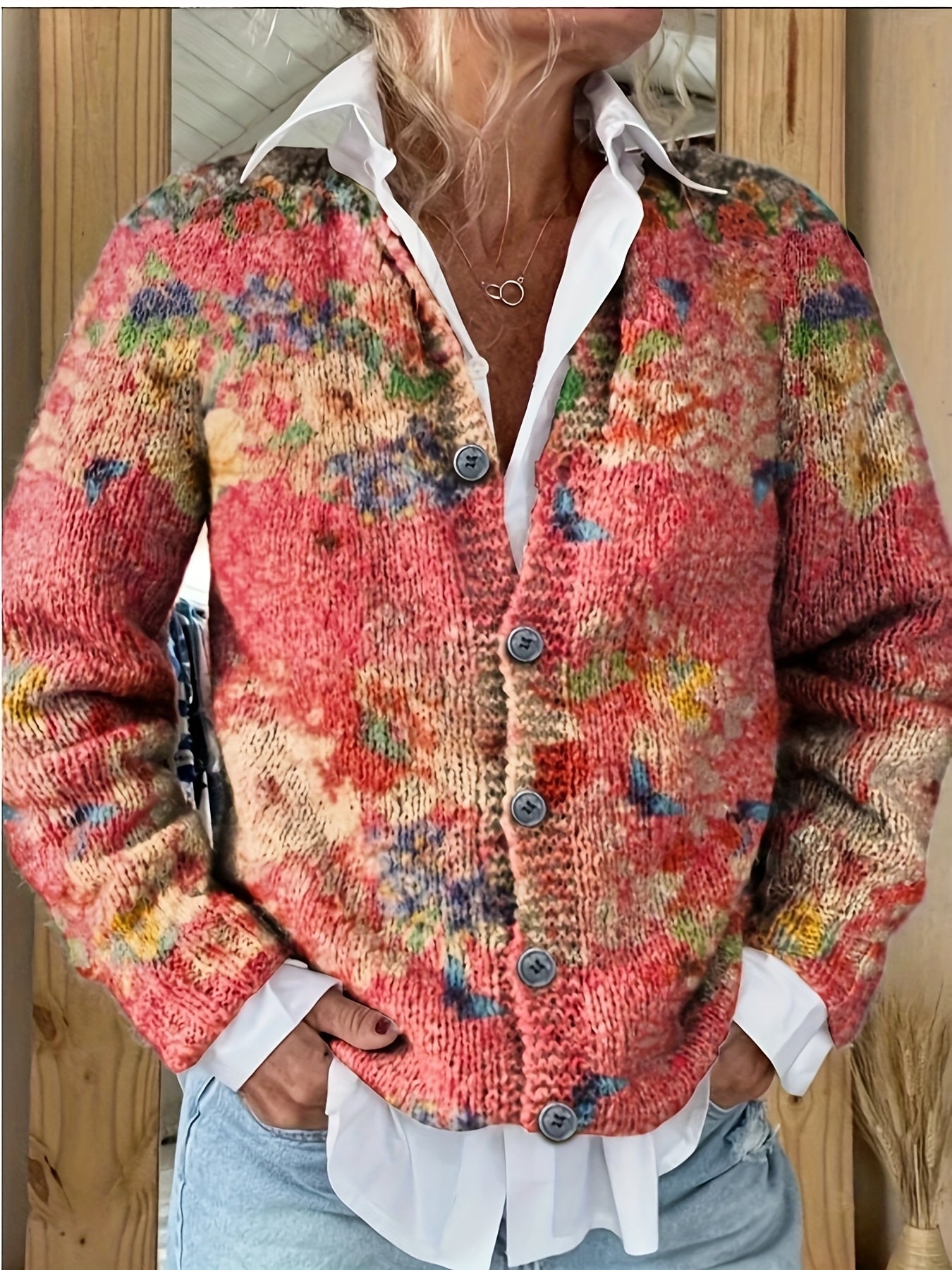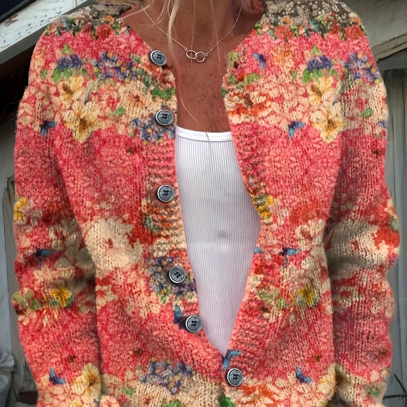 Verity-Vibrant Floral Print Button-Front Cardigan