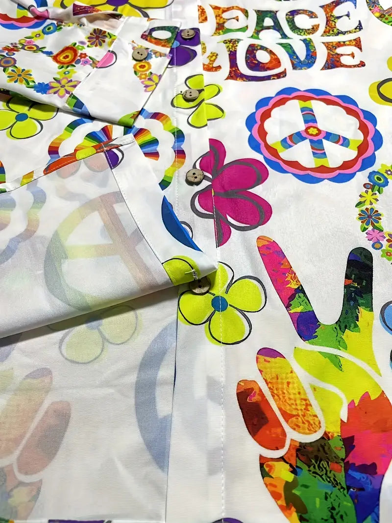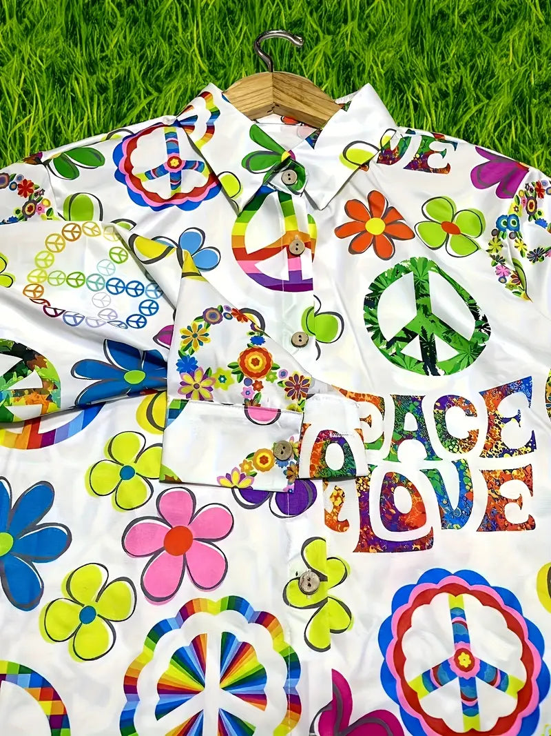 Elevate your wardrobe with this floral blouse, designed for a comfortable yet playful look. It features a button-down front with a spread collar, long sleeves with roll-up tabs, a relaxed fit with a slightly curved hem, and a lightweight fabric with a vibrant floral and peace sign pattern, creating a versatile silhouette. Perfect for casual outings or warm-weather settings.