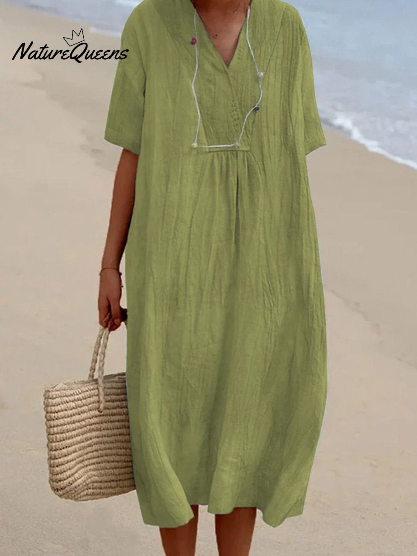 Harriet- Solid Color Cotton And Linen Short Sleeve Dress